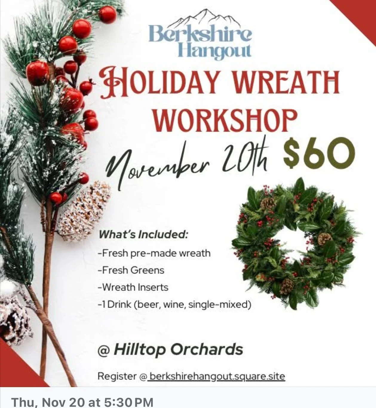 Holiday Wreath Workshop Thursday, November 20, 2025 5:30 PM 7:30 PM Hilltop Orchards 508 Canaan Road / Route 295 Richmond, MA 01254 USA (map) Google Calendar ICS