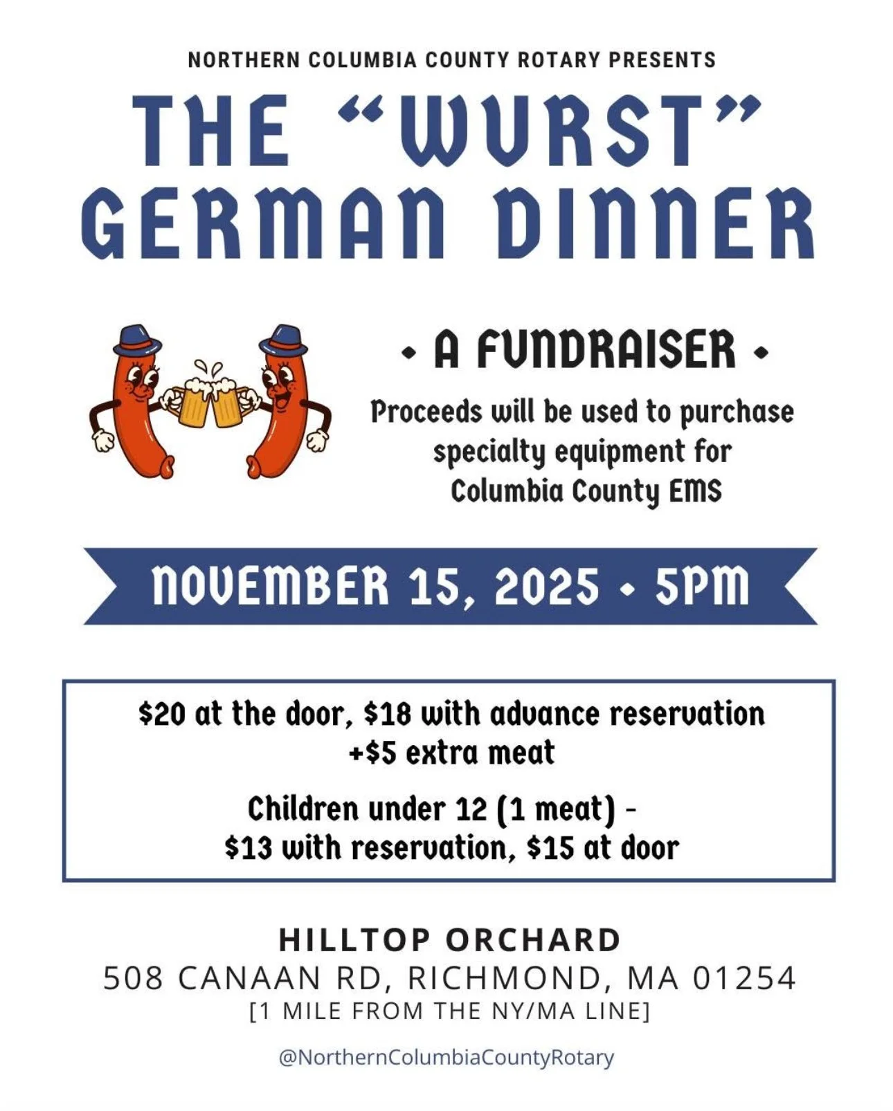 The Wurst German Dinner Saturday, November 15, 2025 5:00 PM 7:00 PM Hilltop Orchards 508 Canaan Road / Route 295 Richmond, MA 01254 USA (map) Google Calendar ICS